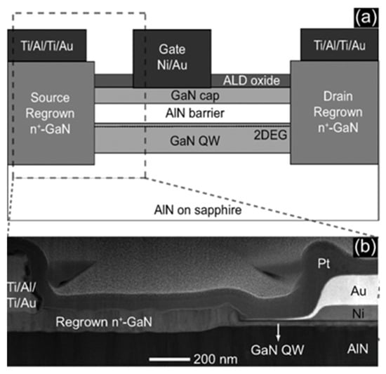 (a) Device structures of GaN HEMT with regrown ohmic layer. (b) STEM image showing regrown GaN connected to the GaN QW channel [85]. Figure reproduced with permission from IEEE Electron Device Lett.