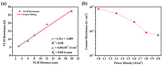 (a) The contact resistance of implanted sample pulsed laser annealing shows a low contact resistance of 6.84 × 10−7 Ω cm2. (b) The contact resistance under different power densities of pulsed laser annealing [86]. (Data from [86]).