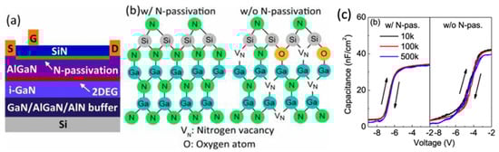- Liu, S.; Chen, B.; Lin, Y.; Hsieh, T.; Wang, H.; Chang, E.Y. GaN MIS-HEMTs With Nitrogen Passivation for Power Device Applications. IEEE Electron Device Lett. 2014, 35, 1001–1003. [Google Scholar] [CrossRef]
