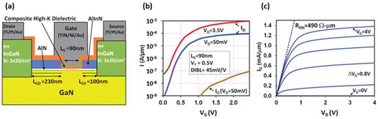 - Dasgupta, S.; Nidhi; Brown, D.F.; Wu, F.; Keller, S.; Speck, J.S.; Mishra, U.K. Ultralow nonalloyed Ohmic contact resistance to self aligned N-polar GaN high electron mobility transistors by In(Ga)N regrowth. Appl. Phys. Lett. 2010, 96, 143504. [Google Scholar] [CrossRef]