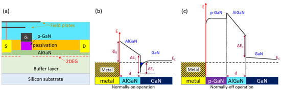(a) Cross-sectional schematic of p-GaN gate HEMT [102] and (b) schematic of the operation principle of the normally on HEMT and (c) normally off HEMT [99]. (Data from [99,102]).