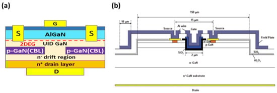 Unlike lateral devices being grown on SiC or Si substrates, vertical devices need to be grown on GaN bulk substrates. One typical vertical GaN-on-GaN HEMT device is the current aperture vertical electron transistor (CAVET) [107] shown in Figure 20a. The 2D electron gas channel formed at the interface between AlGaN and GaN is used in conjunction with the bulk GaN drift region to achieve low on-resistance. Since the blocking voltage of the device is sustained in a vertical direction into the bulk of the device, the breakdown voltage at the same specific current can be much higher than the HEMT. In this type of device, planar gates control the electron flow in the 2DEG channel, and electrons will then flow vertically towards the n-GaN drift region through a conductive aperture between the current blocking layers (CBLs), thereby holding the blocking voltage into the device bulk. Another type of vertical GaN device is the vertical GaN trench MOSFET [108]. As depicted in Figure 20b, the gate trench is buried into the p-type channel layer. The inversion channel is formed at the sidewall of the trench gate during the “on” state. Then, the thick bulk n-drift region conducts the current to the bottom drain electrode. As mentioned previously, such types of devices have been shown to sustain a voltage above 1.5 kV. The requirement of extensive passivation and field planting in a lateral device such as an HEMT was eliminated in the case of the vertical device due to the presence of a high electric field inside the bulk which also alleviates current collapse due to surface traps.