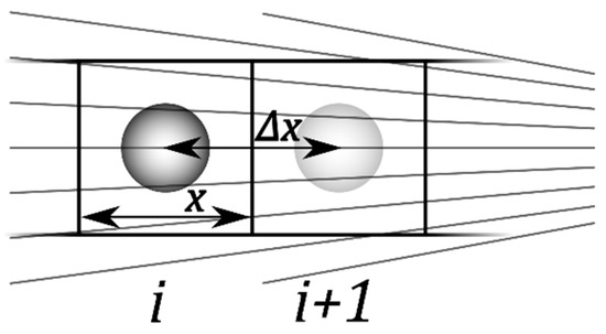 Consider the work performed to charge the two boxes i and i + 1 (Figure 1). Despite the inhomogeneous field, it is assumed that the two boxes i and i + 1 are flooded by the homogeneous fields and , respectively (Equation (1)). The fields are effective in the centers of the boxes at the considered locations of the object. In the first step of the DEP cycle, both boxes are discharged, box i in the presence of the object and box i + 1 in its absence. The conducted work is (Equations (1), (15) and (16)):