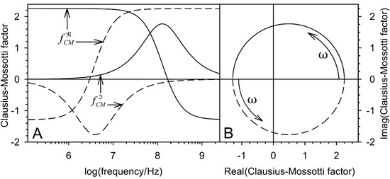 The real and imaginary parts of the Clausius-Mossotti factor represent the normalized DEP force and ROT torque, which are usually plotted over frequency (Figure 2A) or in the complex plain (Figure 2B).