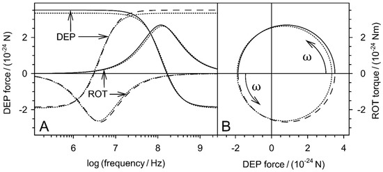 Frequency (A) and complex plots (B) of DEP-force and ROT-torque spectra of the two spheres of Figure 2 according to Equations (27) and (32) compared with the classical model (dotted lines; Equations (4), (7), (28) and (31)). All spectra were calculated for field strengths of 1 V/m. To obtain corresponding numerical values of forces and moments, the DEP forces were calculated for .