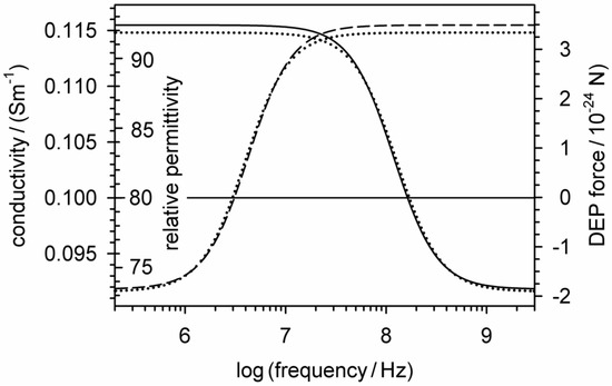 Figure 4 illustrates Equations (26) and (36), i.e., the real parts of the relative permittivity and conductivity in the box with the suspended object. Comparison of the two equations with Equation (27) shows different frequency-independent prefactors and an additional offset. If this is considered, the right ordinate can be rescaled so that the DEP force (Equation (27)) is represented by the same function plots.