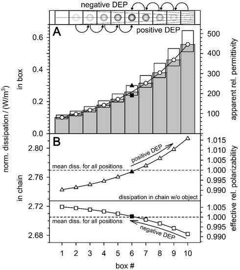 Figure 6B illustrates the DEP effects on the entire box chain considered as a DEP system. Without the object, the field-normalized total dissipation in the chain corresponds to the sum of the 10 boxes (full horizontal line). In the presence of the weakly or strongly conducting sphere, one box contributes to the total dissipation according to Equation (34). The mean chain dissipations (dashed horizontal lines) were calculated assuming a probability 0.1 uniform distribution for the presence of the spheres in each of the boxes. The curves show the dissipation for successive positions of the spheres during DEP translation. In both cases, positive and negative DEP, the field-induced translation leads to an increase in the total dissipation and effective relative polarizability of the DEP system. The latter was calculated by normalizing the sum of the apparent relative permittivities for each sphere position (Figure 6A) to the mean of all positions. The effective relative polarizabilities of one (right ordinate) correspond to the mean dissipations in the entire chain for uniformly distributed (starting) positions of the spheres (dashed horizontal lines). The effective relative polarizabilities of the chain can be used to describe how DEP “conditions” the overall polarizability of the chain system.