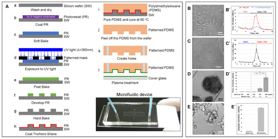 Cell culture continues to be cost effective and lends itself to high throughput screening while circumventing the ethical and regulatory considerations pertaining to animal models. The development of unique in vitro models provides a system that can not only mimic tissue–tissue interactions but can also mimic the physical microenvironment in which the cells of interest are found. The application of microfluidic-based organ-on-a-chip models to reproduce complex structural and functional living human organs is indispensable in understanding diverse biological responses and elucidating disease mechanisms. Microfluidic device can be fabricated through photolithography and soft lithography techniques (Figure 2A) [55].