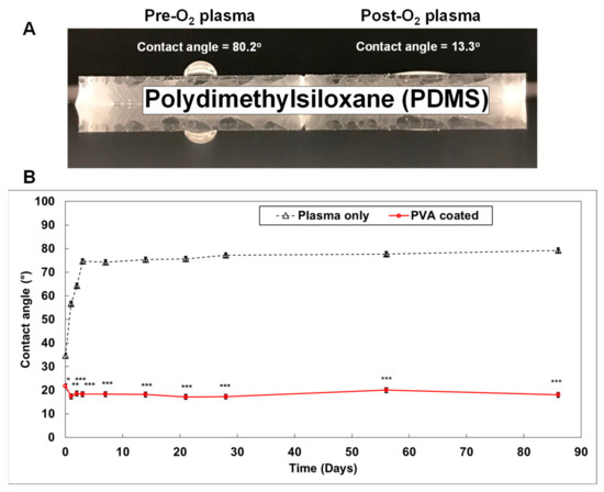 A major issue with regard to PDMS is that small molecules can adsorb onto the highly hydrophobic PDMS surface (contact angle > 75°) (Figure 3A) [91,93]. This is a notable disadvantage in studies focused on drug delivery and drug discovery [94,95]. To address this challenge, the PDMS surface is exposed to oxygen plasma during the fabrication of the organ-on-a-chip. This process changes the surface to become highly hydrophilic (contact angle < 20°) (Figure 3A). Silanol-functional groups (SiOH) are also created on the PMDS surface. Contact between the silanol groups results in the formation of siloxane bridges (Si-O-Si) on the PDMS surface [96]. This allows permanent bonding of the PDMS surface with glass, or another PDMS surface, without requiring an adhesive. The wettability of the plasma treated PDMS surface, however, is not stable. Regression back to a highly hydrophobic surface occurs within three days (Figure 3B). To overcome this limitation, a smart PDMS has been developed by adding PDMS-PEG block copolymer to the normal PDMS before casting the substance into the mold [91]. This smart PDMS maintains a hydrophilic surface for up to 20 months, with reduced non-specific adsorption of IgG, albumin, and lysozyme [91]. Furthermore, PDMS can be maintained as a hydrophilic surface by coating with the hydrophilic polyvinyl alcohol (PVA) [93]. We demonstrated that PVA coated PDMS maintains a hydrophilic surface (contact angle < 20°) for at least 3 months (Figure 3B).