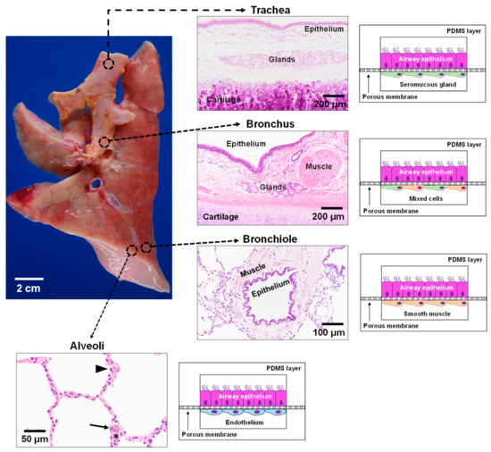 From the trachea, the lung branches into two main bronchi followed by further dichotomous branching subdivisions. While the proximal bronchus resembles the trachea, as more branching occurs, the mural cartilage is lost, with smooth muscle being a prominent component of the airway wall. The changing airway microenvironment necessitates the design of a different model to mimic the human lung bronchus. Again, human epithelial cells are cultured at an air–liquid interface on the porous membrane; both human serous and mucous gland cells and human smooth muscle are cultured on the other side with continual perfusion of growth medium. The inclusion of both serous gland cells and smooth muscle cells mimics the microstructural changes in the lung. More specifically, there is a shift from a more rigid cartilaginous structure in the trachea to the less rigid bronchi where smooth muscle and elastic pressure become more prominent.