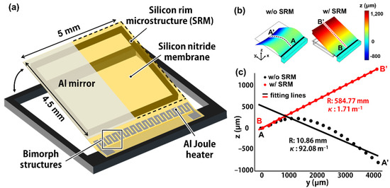 Figure 1. (a) Schematic of a silicon micro (μ) rim-loaded MEMS mirror (SRM-mirror), consisting of aluminum (Al) thin mirror, silicon nitride membrane, bimorph structures, and the silicon micro rim; (b) Numerical analysis on film flatness of SRM-mirror depending on the rim, by using finite element method (FEM) simulation; (c) The cross-sectional profiles (i.e., A-A′, B-B′ in (b)) of the thin mirror membrane with/without the SRM, and the calculated curvature (κ) and radii of curvature (R).