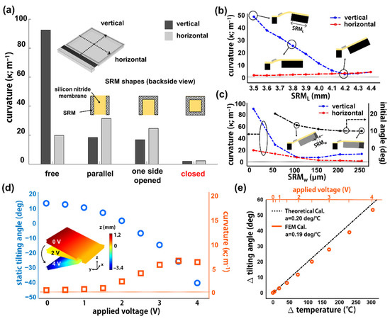 Figure 2. Numerical analysis on the film flatness and electrothermal actuation of SRM-mirror. Calculated curvatures of SRM-mirror depending on (a) the shape; (b) length; (c) width of silicon rims; (d) Tilting angles and film curvatures of SRM-mirror during electrothermal actuation with voltages increasing from 0 VDC to 4 VDC; (e) Comparison of FEM calculation with theoretical calculation.