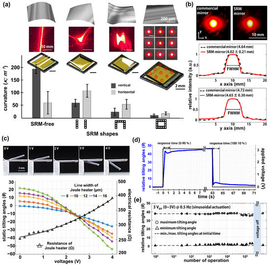 Figure 4. Mechanical and optical characterization of the SRM-mirror. (a) Measured film curvatures of the SRM-mirror depending on the shape of silicon rims. Insets correspond to 3D-reconstructed images of membrane (top row), images of reflected laser spots (middle row), and optical images (bottom row); (b) Beam profile analysis of reflected laser beam spots from a commercial mirror and SRM-mirror; (c) Measured tilting angles of the SRM-mirror and resistances of the Al Joule heater during electrothermal actuation with varied voltages from 0 VDC to 4 VDC. Insets are side-view images of the SRM-mirror during actuation; (d) Step response of the SRM-mirror with static actuation between the voltages of 0 VDC and 3 VDC; (e) Fatigue test of the SRM-mirror. The sinusoidal waveform with 0.5 Hz/3 Vpp (0–3 V) was applied for three days. The minimum and maximum tilting angles were measured at the specified time.
