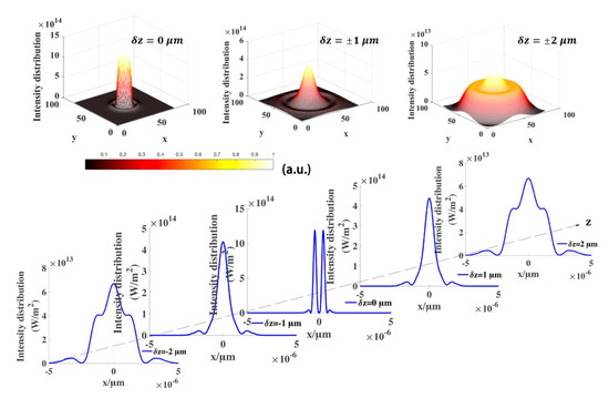 The evolutions of the focusing characteristics of the elegant TH3GBs versus x for several are illustrated in Figure 2. Term represents the distance between the focal and output planes. It is clearly observed from Figure 2 that the intensity distribution is sensitive to . TH3GBs has rotational symmetry of the doughnut-shaped intensity at . We find that the intensity of the beams is doughnut-shaped at the center of the focusing plane and tiny side lobes are located near the main peaks, therefore, low refractive index particles can be trapped at the dark center of the focal plane of the focused beam. Away from the focus (by decreasing or increasing δz), the intensity profiles of the focused beam gradually transform into a single peak distribution with a maximum intensity at its center. The hollow profile of the elegant TH3GBs disappears. Owing to the focus prosperities of the elegant TH3GBs, we expect these beams to be used for capturing two kinds of particles with different refractive indexes.