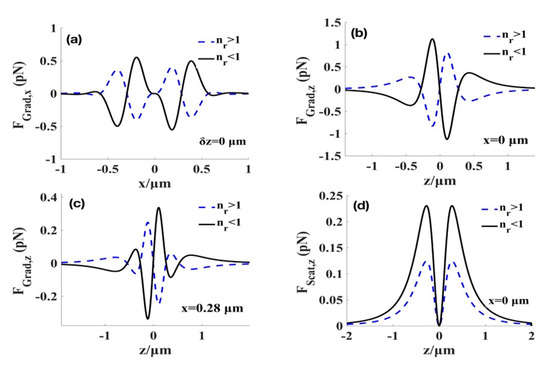 Figure 3 illustrates the distributions of the longitudinal and transverse radiation forces of the focused elegant TH3GBs exerted on the high-index ( and low-index () particles. The sign of the gradient force represents the direction of the force: for the positive the transverse gradient force is along the +x direction, whereas for the negative is along the -x direction. Similarly, for positive (negative) , the longitudinal gradient force is in the +z (−z) direction. The scattering force is always along the +z direction (as can be seen in Figure 3b). From Figure 3a,b, we can observe that there is an equilibrium point at the focus for the low-index particles, and the gradient force along the z-direction (as can be seen in Figure 3b) is always larger than the forward-scattering force as shown in Figure 3d. This indicates that the particles with a low index can be stably trapped by the elegant TH3GBs at the focus. From Figure 3d, we note that the scattering acting on the low-index particle at the focus of the focused elegant TH3GBs force is zero. From Figure 3a,c, we find that two equilibrium points are present () near the focus where the high-index particle (can be trapped. Therefore, Figure 3 demonstrated that the focused elegant TH3GBs can simultaneously manipulate or trap two types of particles, and this is superior to the fundamental Gaussian beams that have no equilibrium point for low-index particles at the focus.