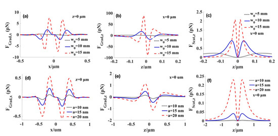 The effects of the waist radius of the beams and those of particles through the radiation forces exerted on the low-index particles are indicated in Figure 4. From Figure 4a–c, we find that as the waist radius of the beam increases, both the gradient and scattering forces increase, but the transverse region of trapping particles shrinks. Therefore, the larger value of ω0 corresponds to the easier trapping for the low-index particles. Similarly, by increasing the radius of particles in Figure 4d–f, the radiation forces also increase, but the transverse trapping range is not affected by the radius of particles. Consequently, the stiffness of the optical trap can be enhanced by adjusting the value of ω0.