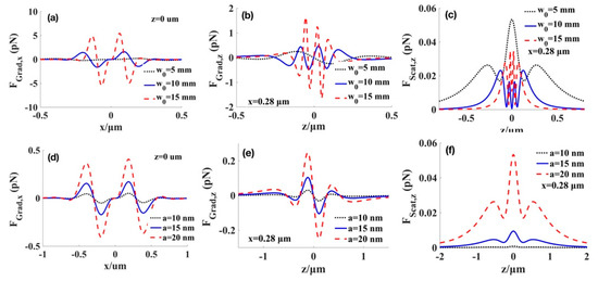 Figure 5 illustrates the changes of the gradient and scattering forces exerted on the high-index particles for several values of the waist radius of the beams and those of the particles. The transverse gradient forces increase as the value of the waist radius increases, similar to the case of low-index particles as shown in Figure 5a. Figure 5b–c depicts the longitudinal gradient force at the point , whereas Figure 5e,f plots the scattering force at the point . Figure 5b,c show that the position of the trapped high-index particles is closely related to the value of waist radius. From Figure 5d–f, it can be found that when the radius of particles becomes larger, the radiation force will also become larger; thus, the magnitudes of transverse and longitudinal gradient forces can be modulated by the radius of particles without affecting the trapping range. Figure 5c,f show that compared with the longitudinal gradient force in Figure 5b,e, the magnitude of the scattering forces is significantly smaller than the axial gradient force.