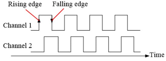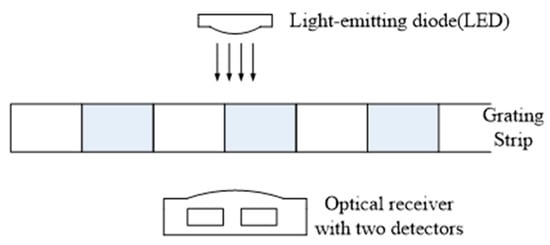 There are several existed solutions for finger joint angle measurement. However, the low cost IMU sensor has a gyro-drift problem, the ordinary optical fiber is sensitive to environmental temperature, and FBG needs a special signal demodulator and is not portable. In this paper, a flexible grating strip is employed as the sensor unit to measure the finger joint angle. There are equidistant parallel opaque stripes in the grating strip. As shown in Figure 1, with the help of a light-emitting diode (LED) and an optical receiver, we can detect the movement of the grating. When light strikes on the opaque strip, the detector outputs a low level since it cannot receive an optical signal. On the contrary, the detector outputs a high level when light strikes on the transparent area. When the detector position is fixed and the grating moves relative to the detector, the detector will output a series of pulse signals. The number of pulses is proportional to the movement of the grating. That is to say, the amount of grating movement can be calculated by counting the output pulse of the detector. Since the two detectors in the optical receivers are placed side by side along the direction of the grating’s movement, one detector will always receive the light signal before the other detector when the movement of the grating is identified. Figure 2 shows a typical pulse signal output by the optical receiver. Based on the description above and the typical pulse signals shown in Figure 2, the moving direction of the grating strip can be determined by detecting the sequence of rising edges of two signals. Based on the identified movement direction, the displacement of the grating strip can be obtained by counting the number of edges in the signal.