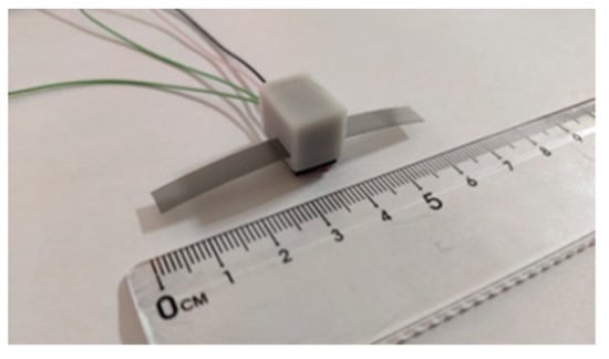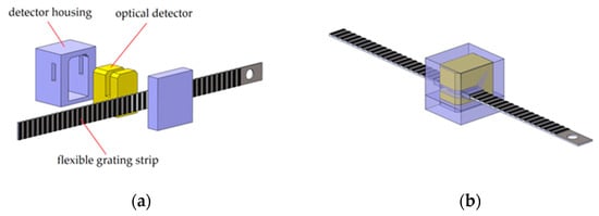 Figure 3 shows the prototype of the designed sensing unit. It contains three units: a flexible grating strip, an optical detector, and a detector housing. The optical detector is fixed in the detector housing. A gap on each side of the shell is set to make the grating strip move smoothly. Figure 4 is the picture of the designed sensing unit.