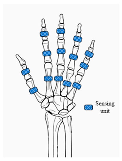 To obtain the information about the bending of each joint of the finger, the configuration of the glove is designed with sensing units, as shown in Figure 6. Fourteen sensing units are arranged on the back of the glove. There is a sensing unit on the back of the middle phalange, proximal phalange and metacarpal of each finger, except for the thumb. For the thumb, two sensing units are distributed on the back of the proximal phalange and metacarpal, respectively. For the grating strip in each sensing unit, one side of the strip is fixed on the back of the glove; the other side is unconstrained and can be moved freely. As a result, the DIP, PIP and MCP joints of index, middle, ring and little fingers and the DIP and MCP joints of the thumb can be captured.