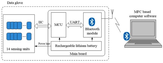 Because two channels of signals are related to the joint angle for each sensing unit, and 14 sensing units are distributed on the back of the glove, a large number of wires are needed to connect signals to the glove’s microprocessor unit (MCU). As shown in Figure 7, in order to reduce the number of wires, a distributed signals processing and connection architecture is designed in this paper.