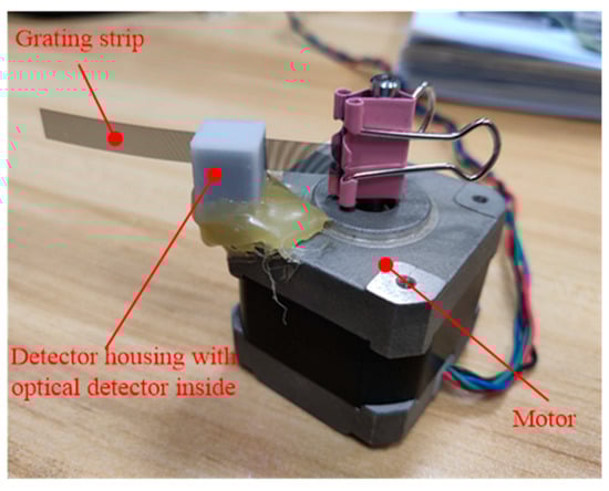 Since we do not know the material properties of the grating strips, the experimental was conducted to verify the durability of the grating strip used in the design. As shown in Figure 9, the grating strip and the sensing unit are fixed on the motor output shaft and motor shell, respectively. The motor is controlled to do a reciprocating motion of 120° to simulate the bending of fingers. Two gratings were randomly selected for testing. After the motor reciprocating for 20,000 times, the grating bars did not break. And, there is no obvious wear on the surface of the grating strip, which will not affect its sensing function.