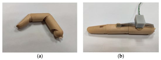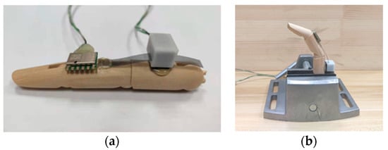 Calibration experiment platform. (a) Wooden finger model with a sensing unit and a gyroscope; (b) Wooden finger on the flat tongs.