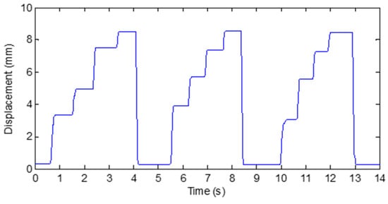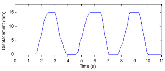 The displacement of the grating strip is recorded during the reciprocating rotation of the finger’s PIP joint, and the corresponding curve as shown in Figure 11 is obtained. It is found that the displacement of the grating strip always changes between 0 and 16 mm, demonstrating the stable and repeatable response of the grating strip when the finger joint is bent.