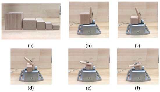 Five calibration points set by five wooden blocks with different heights. (a) Wooden blocks used to set bending angles; (b) Bending angle is 0°; (c) Bending angle is 21.53°; (d) Bending angle is 48.07°; (e) Bending angle is 72.25°; (f) Bending angle is 96.18°.