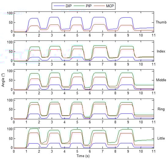 In this paper, the θrange values of the MCP and PIP of the thumb are preset to 80° and 90°, respectively. For the other fingers, the θrange values of the MCP, PIP and DIP are preset to 90°, 110°, and 30°, respectively.