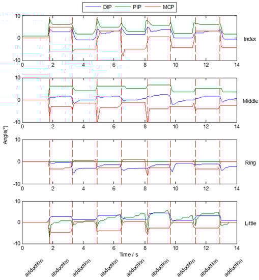 Finger joint angles when a subject makes a continuous abduction and adduction motion.