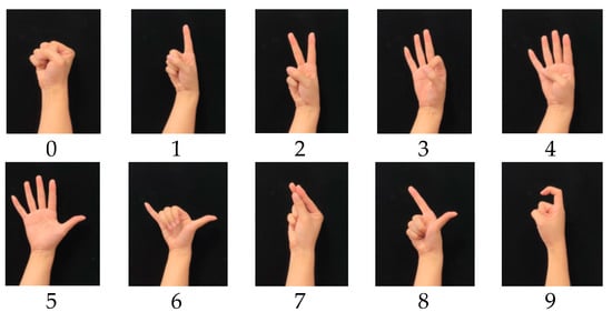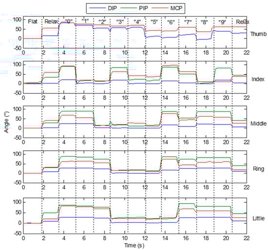 Gestures are a common way for people to communicate and convey information in daily life. A lot of research has been done on gesture recognition based on finger bending information [,,,,]. In this paper, static gesture recognition based on the designed data glove and neural network is conducted to verify the effectiveness of the designed glove in daily application. As shown in Figure 19, ten static gestures that represent numbers 0 to 9 are selected as the recognition targets. Figure 20 shows the finger joint angles when a subject continuously makes different digital gestures.
