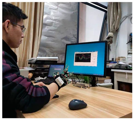 The ten subjects in Experiment Section 3.2.2 participate in the digital gesture recognition experiment. Figure 21 shows the experimental scene. Subjects sit in front of a computer with their right forearms on the table and data gloves on their right hands. Subjects are allowed five minutes to familiarize themselves with the experiments beforehand. In the experiments, they make gestures 100 times as instructed in the computer software. The instruction for each gesture appears 10 times at random. During this process, the finger bending data collected by the data glove and the gesture are recorded synchronously by the computer software.