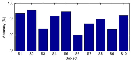 Table 7 shows the confusion matrix of the gesture recognition experiment for Test A. The overall recognition accuracy is 98.8%. Figure 22 shows the results for Test B. When the network trained by the data of one subject is used to recognize the gestures of other subjects, the recognition accuracy is between 90% and 97.8%. It indicates that a network trained with data from a single subject can be used to recognize the gestures of other subjects.