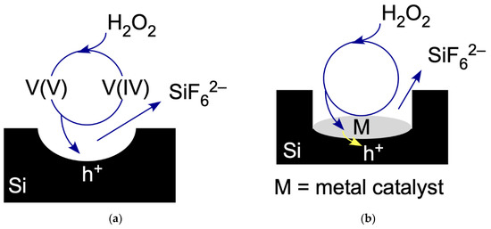 - Kolasinski, K.W.; Barclay, W.B.; Sun, Y.; Aindow, M. The stoichiometry of metal assisted etching of Si in V2O5 + HF and HOOH + HF solutions. Electrochim. Acta 2015, 158, 219–228. [Google Scholar] [CrossRef]