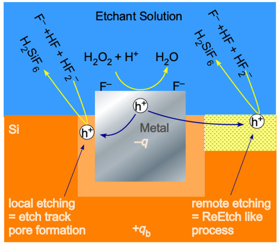 Rezvani et al. [94] directly measured that the metal nanoparticles are biased negative with respect to Si during MACE. One consequence of this effective negative charge is the formation of an image dipole that attracts the metal to the semiconductor. This is important to explain [72] the etching of particles on all sides for which, unlike the illustration shown in Figure 2, there are no natural up or down directions. A second consequence is that the metal nanoparticle effectively acts as a local potentiostat powered by H2O2 decomposition that polarizes the surrounding Si. In this picture, the local region is biased into the electropolishing regime, which completely removes Si and forms etch track pores beneath the metal catalyst. Further away in the remote region, the Si is biased below the critical potential and the semiconductor etches in the mesopore formation regime.