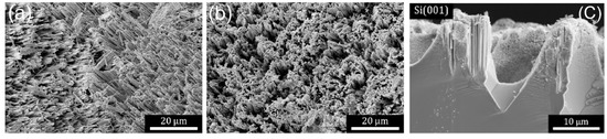 Using the techniques described in the previous section, electronics grade (EG-Si) or metallurgical grade (MG-Si) silicon with arbitrary size and characteristics can be etched: single crystalline or polycrystalline, n or p type, highly doped/impure, or low doped. Figure 3 demonstrates that both EG- and MG-Si powder particles are etched by conventional HL-MACE to generate particles with roughly the same morphology; numerous, mostly parallel etch track pores are formed leaving behind random ridge-like structures [72]. The formation of etch track pores primarily directed along {001} directions is confirmed by cross-sectional scanning electron microscope (SEM) images from both powders and single-crystal wafers, as shown for the latter in Figure 3c. The structure of the particles shown in Figure 3 is consistent with SEM images reported by Ouertani et al. [113], who also found that Ag-catalyzed MACE of MG-Si tends to improve the crystallinity due to the removal of amorphous material and impurities. The removal of impurities resulting from MACE to upgrade MG-Si to solar-grade Si has been studied extensively by Li et al. [114,115,116].