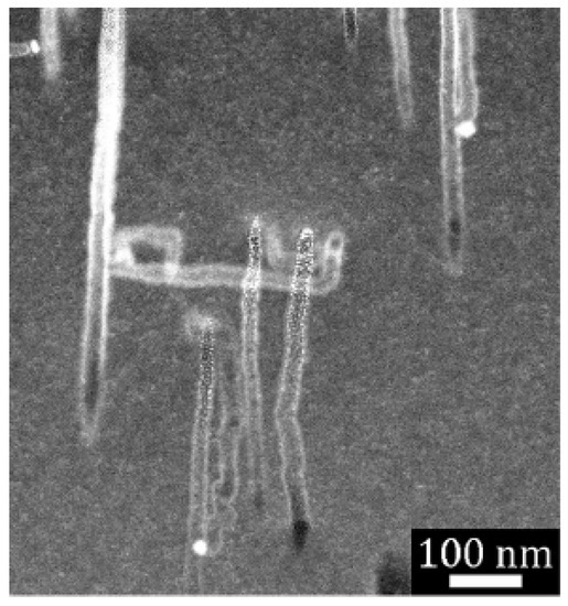 High-angle annular dark-field (HAADF) scanning transmission electron microscopy (STEM) image of focused ion beam (FIB)-cut cross section of a semiconductor grade moderately doped Si(110) wafer. Local etching results in the formation of crystallographically defined etch track pores primarily along {001} directions when HL MACE is performed. Copyright © 2021 Kolasinski, Unger, Ernst and Aindow. Reproduced under Creative Commons Attribution License (CC BY) from Ref. [72].