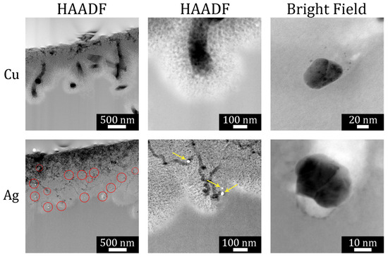 HAADF STEM image of FIB-cut cross section of a metallurgical grade Si particle etched with LL-MACE catalyzed by either Cu or Ag nanoparticles (first two columns). The bright field images in the third column show individual Cu (upper) and Ag (lower) nanoparticle catalysts embedded in Si after etching. Ag nanoparticles are observed as bright spots. Local etching results in uncorrelated, meandering etch track pores, while tortuous mesopores are created by remote etching. Reproduced with permission from Ref. [66]. Copyright © 2020, American Chemical Society.