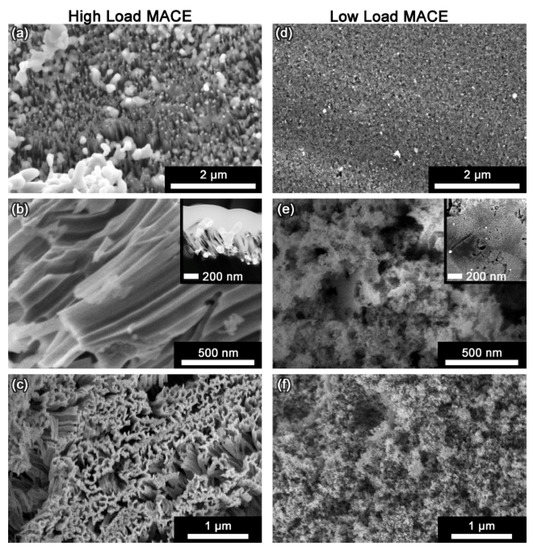 Contrasting structures associated with HL and LL regimes. High-load MACE with Ag (left-hand column) is characterized by: (a) Deposition of a thick metal layer composed of dendrites as well as nanoscale and microscale metal particles (plan view); (b) etching proceeds with correlated motion of the metal nanoparticles to form predominantly 70–100 nm parallel etch track pores (cross section); (c) production of etched silicon particles that are rough in texture and covered with ridges formed by the etch track pores (plan view). Low-load MACE (right-hand column) is characterized by (d) light deposition of dispersed individual metal nanoparticles (plan view); (e) uncorrelated etching of random 10–50 nm etch track pores that are surrounded by remotely etched 3–6 nm tortuous pores (cross section); (f) production of etched particles that are relatively smooth in texture with randomized pores (plan view). Reproduced with permission from Ref. [65]. Copyright © 2020, American Chemical Society.