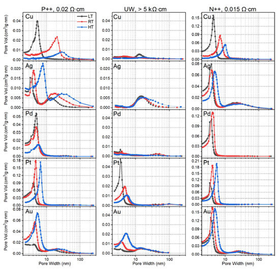 The low-load regime is not merely a curiosity. Figure 7 demonstrates a remarkable property, i.e., LL-MACE can be used to choose the pore size distribution based upon the choice of experimental parameters. Tamarov et al. [65] found that the partitioning of remote to local etching as well as the size and behavior of the metal nanoparticle depended on (1) the elemental composition of the metal nanoparticle, (2) the doping type and level of the Si, and (3) the temperature of the etchant. By choosing between Ag, Au, Cu, Pd, and Pt over a temperature range of roughly 0–50 °C, and using different types of Si, the mean pore size was varied as well as whether the distribution was composed of one or two maxima.