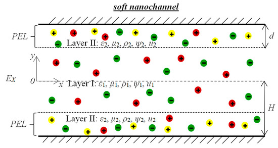 The soft nanochannel of electroosmotic thrusters is shown in Figure 1. The working fluid between two parallel plates or slit-like channels is deemed as an incompressible viscous Newtonian fluid. The fluid is driven by electroosmotic body forces, which are generated by the applied electric field at strength Ex along the main flow direction, and synchronously squirted from the channel to obtain the required thrust and energy. The nanochannel height is defined as 2H, the length is L, and the depth is W. It is assumed that the length and depth are both much larger than the height, i.e., L >> H, W >> H, so that the flow field is simplified as unidirectional and inertia-free. The soft channel includes a wall-grafted, ion-penetrable, charged polyelectrolyte layer (PEL) whose thickness is set as d. The PEL is considered to be homogenous and dense so that the rearrangement of ions reacts and Born energy appears in the entailing electrokinetic system. Physically speaking, the Born energy means the work of diverting an ion from the bulk solvent to the bulk of the membrane, which is related to the fluid permittivity. Different permittivity and fluid viscosities for the electrolyte layer and PEL are considered so as to acquire valid solutions at high PEL densities. The electrolyte solution layer and the dense PEL are viewed as layer I and layer II respectively, with layer I sandwiched by layer II, as shown in Figure 1. We further establish a two-dimensional Cartesian coordinate system at the channel center for convenience. It is hypothesized that the liquid is an ideal steady, fully developed salt that is symmetric in regard to the x-axis, and the temperature over the channel cross-section is negligible. Under these conditions, the fluid electric potential and charge density are calculated at an average temperature.