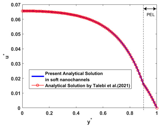 To verify the correctness of the current result about electroosmotic velocity in the thruster, we first compared with the previous work investigated by Talebi et al. [45]. The comparison of the dimensionless results is presented in Figure 2, because the nondimensional solutions in the study of Talebi et al. [45] are discussed and the scale of the channel model is different in the two studies. In soft channels with the dense polyelectrolyte layer (PEL), our result is in accordance with the velocity distribution in the research of Talebi et al. [45] after converting the wall surface charge density condition and Naiver slip boundary into no surface charge density and no slip boundary conditions on the walls, as shown in Figure 2. Besides, the discontinuity of flow velocity at the electrolyte–PEL interface is obvious owing to the differences of the dielectric permittivity and viscosity for the two layers. The stress balance condition in Equation (27) further explains the discontinuity of the velocity on the electrolyte–PEL interface utilizing the different viscosities for the two layers.