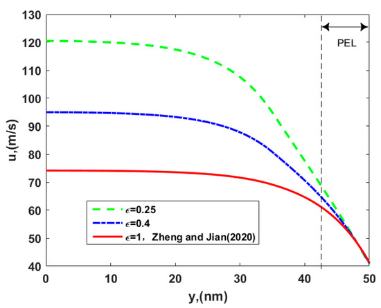 In Figure 3, the velocity profile is described for the different permittivity ratio, ε, of the two layers. The electroosmotic velocity increases as the permittivity ratio decreases. The reduction means that the permittivity of PEL becomes small, which is the reason why ions in the channel prefer to stay within the electrolyte solution layer instead of the dense PEL, i.e., the smaller the permittivity, the smaller the ability to bind the charge. The ion partitioning leads to an enhancement of the ionic concentration outside the PEL, where polyelectrolyte molecules are absent and there is no resistive body force (Stokes retarding force) on fluid particles, so an obvious growth in the velocity appears as the permittivity ratio decreases. Hence, the present velocity is larger than that of Zheng and Jian [35] with relevant parameters ε = μ = 1 in Figure 3.