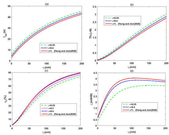 The variations of (a) specific impulse, Isp, (b) thrust, Th, (c) efficiency, ηt, and (d) thrust-to-power ratio, ζ, for the different permittivity ratios for the two layers, ε, with d = 15 nm, μc = 0.34 Pa s/m2, ω = −6.5 mC/m2, λ = 7.5 nm, λFCL/λ = 2, μ = 1, and ρr = 3.