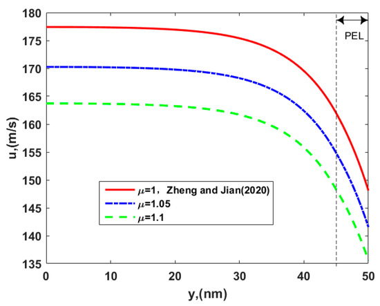 Figure 5 presents the influence of the viscosity ratio of layer II to layer I, μ, on the electroosmotic velocity. The increase of μ generates more resistance of the fluid against flowing in the entire channel, leading to a decrease of the flow speed. Since a larger viscosity ratio means a larger viscosity of the PEL for a fixed μ1, the enhanced viscous force inside the PEL retards the fluid motion. This dense PEL is similar to a polymer brush with a lot of teeth, they produce some resistance to the fluid as the liquid flows through this layer. Therefore, the present velocity of thrusters is smaller than that of Zheng and Jian [35], who did not consider that the PEL was dense, as shown in Figure 5.