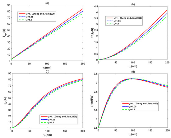 The variations of (a) specific impulse, Isp, (b) thrust, Th, (c) efficiency, ηt, and (d) thrust-to-power ratio, ζ, for the different viscosity ratio of layer II to layer I, μ, with d = 5 nm, μc = 0.34 Pa s/m2, ω = −6.5 mC/m2, λ = 7.5 nm, λFCL/λ = 2, ε = 1, and ρr = 3.