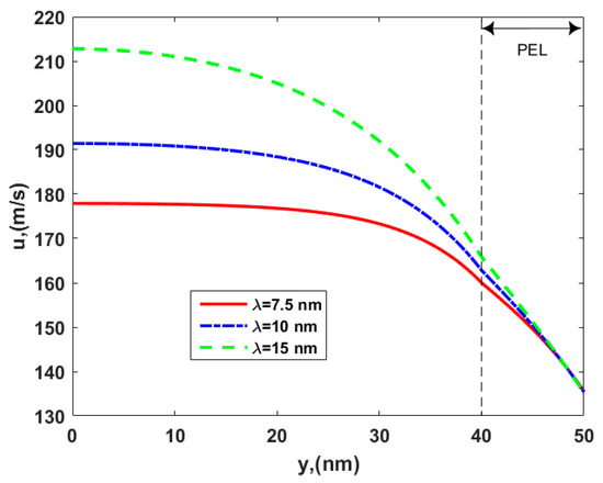 The velocity distribution of the electroosmotic thruster in the soft nanochannel for the different EDL thicknesses, λ, with d = 10 nm, γ = 40 nm, μc = 0.34 Pa s/m2, ω = −6.5 mC/m2, λFCL = 10 nm, μ = 1.25, and ε = 0.5.
