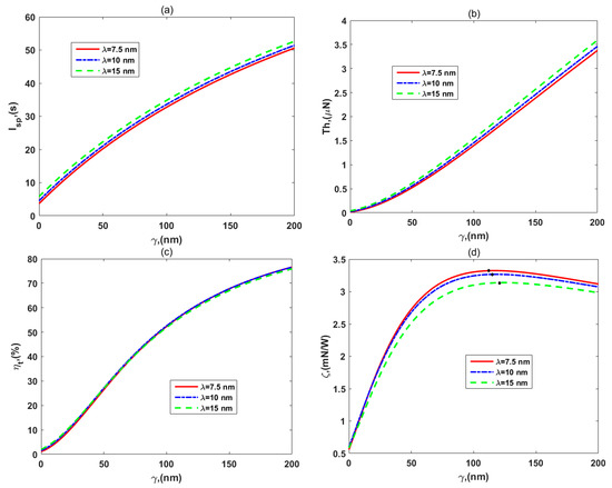 The variations of (a) specific impulse, Isp, (b) thrust, Th, (c) efficiency, ηt, and (d) thrust-to-power ratio, ζ, for the different EDL thicknesses, λ, with d = 10 nm, μc = 0.34 Pa s/m2, ω = −6.5 mC/m2, λFCL = 10 nm, μ = 1.25, ε = 0.5, and ρr = 3.