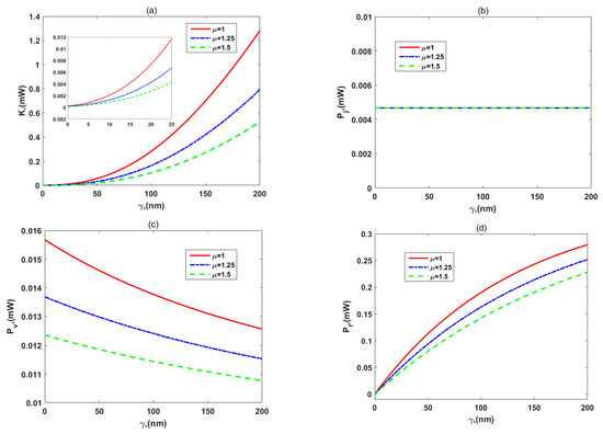 The distributions of (a) the propellant kinetic energy, K, (b) the Joule heating effect, Pj, (c) viscous dissipation, Pv, and (d) slip frictional heating, Pf, on the walls for the slip length, γ, for the different viscosity ratio for the two layers, μ, with d = 5 nm, μc = 0.34 Pa s/m2, ω = −6.5 mC/m2, λ = 7.5 nm, λFCL/λ = 2, ε = 0.5, and ρr = 3.